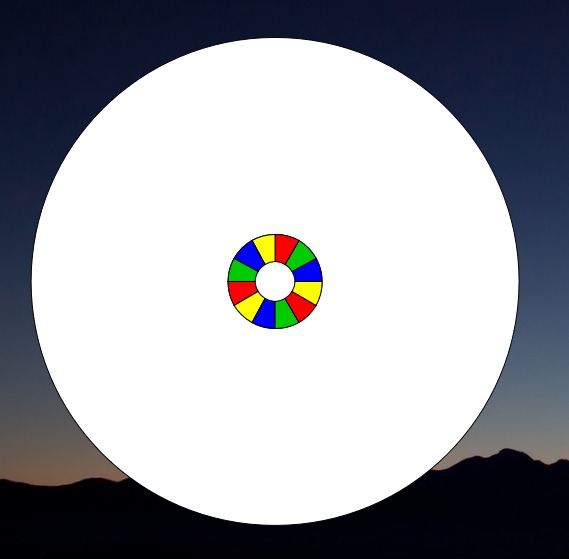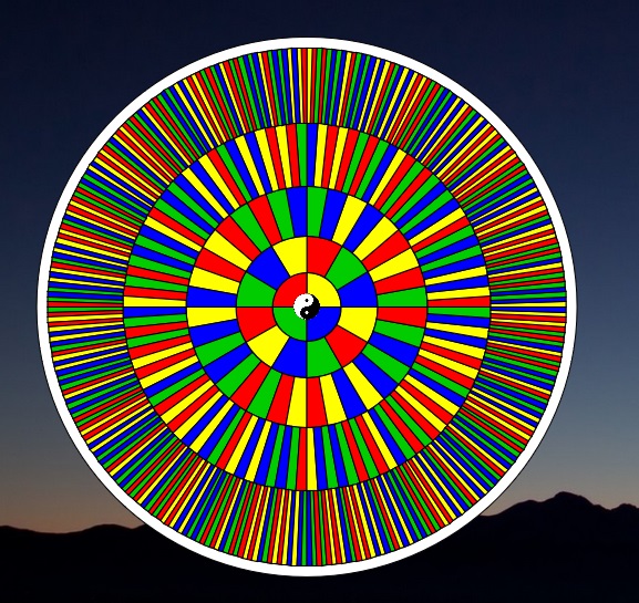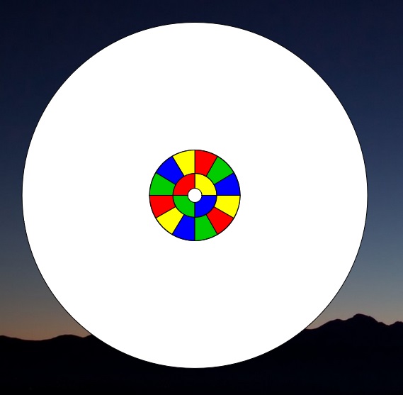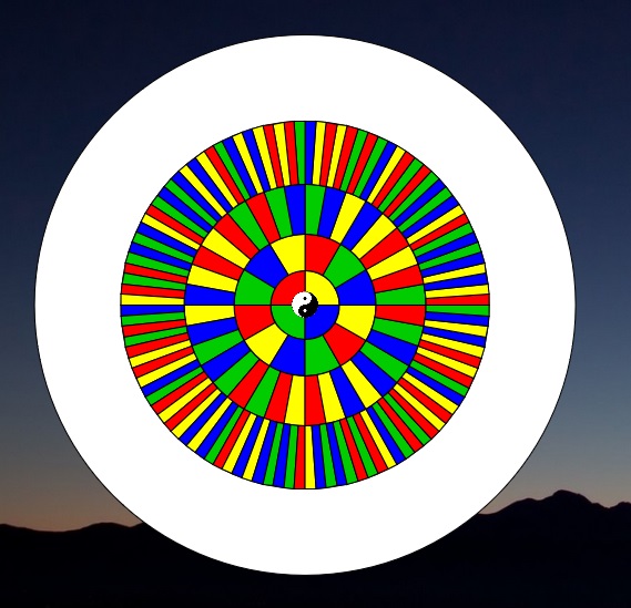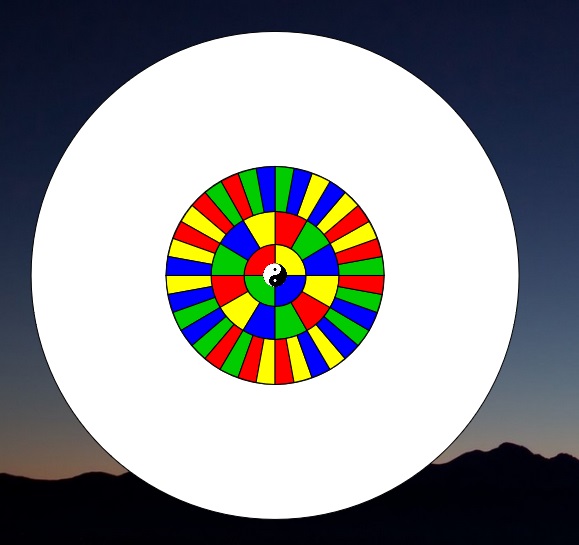 Because I came to this via Astrology, I am starting the explanation of the construction with the elemental pattern of the twelve zodiac signs, using the colours red for Fire, yellow for Earth, blue for Air, and green for Water. The order of the elements has to be that, otherwise the elements would not be ordered in the same manner as which they emerge in practice. Each sign has 30 degrees, because we have a tradition of 360 degrees to a circle - probably from counting with 5 fingers on one hand and 12 knuckles on the other, combined with 365.25 days in a year and 13 lunar months, all being rounded down. From the perspective of the Mandala, base 3 would be an easier counting system, leading to 324 degrees in a circle and 27 in each sign.