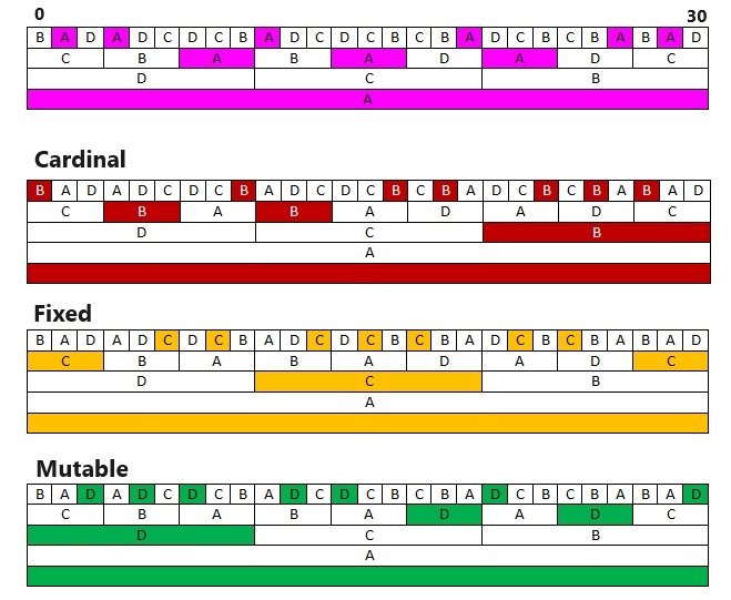 In this picture the first row [pink] represents the occurrence of the sign element throughout the sign. The second to fourth rows show the sign [no colour] with the occurrence of its [quadrant] root element throughout the sign. This is to show why there is a difference between the modes of signs.