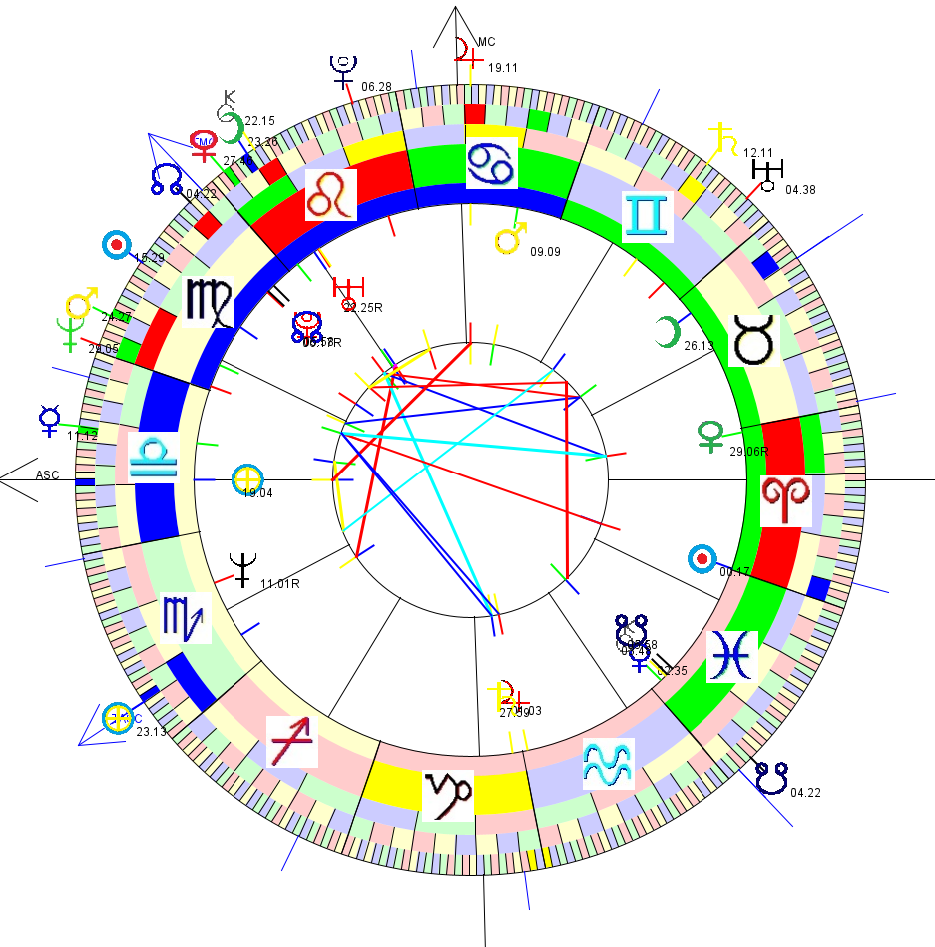 Kathryn does not connect to this 15 degree point natally, but does connect to both parents through the same Sun opposite Neptune and Venus inconjunct Neptune [at 29 degrees Virgo]. Transiting Uranus [at 29 Scorpio] was trine her Sun, inconjunct her Venus. Also, the near conjunction of Saturn and Jupiter was inconjunct her Mercury and Chiron, semisextile her Pluto, and it echoed the near Jupiter Saturn conjunction in her natal chart.