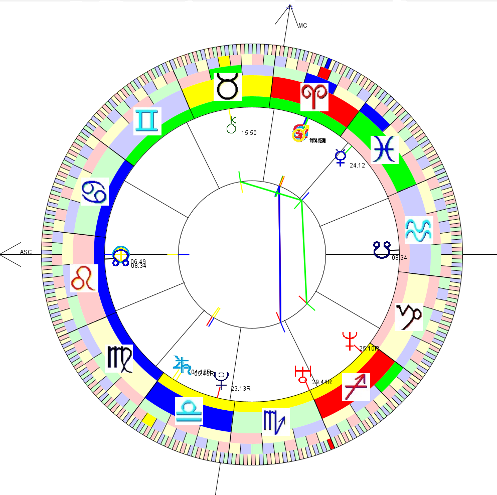 The chart shown is Kathryn Harrison's birthchart, together with transits for the actual kiss at the airport around the outside. Aspect lines [traditional] are between the transits and the birthchart.
