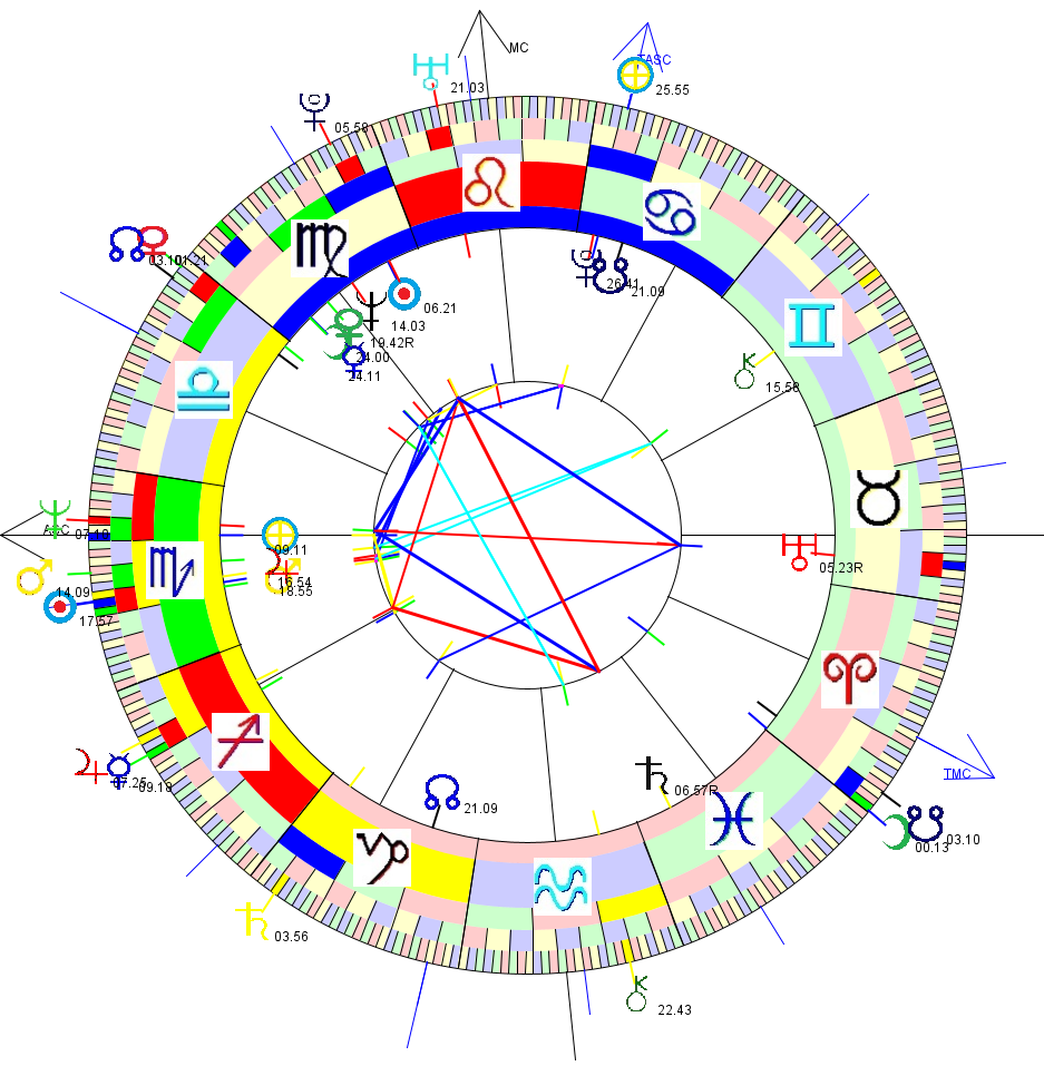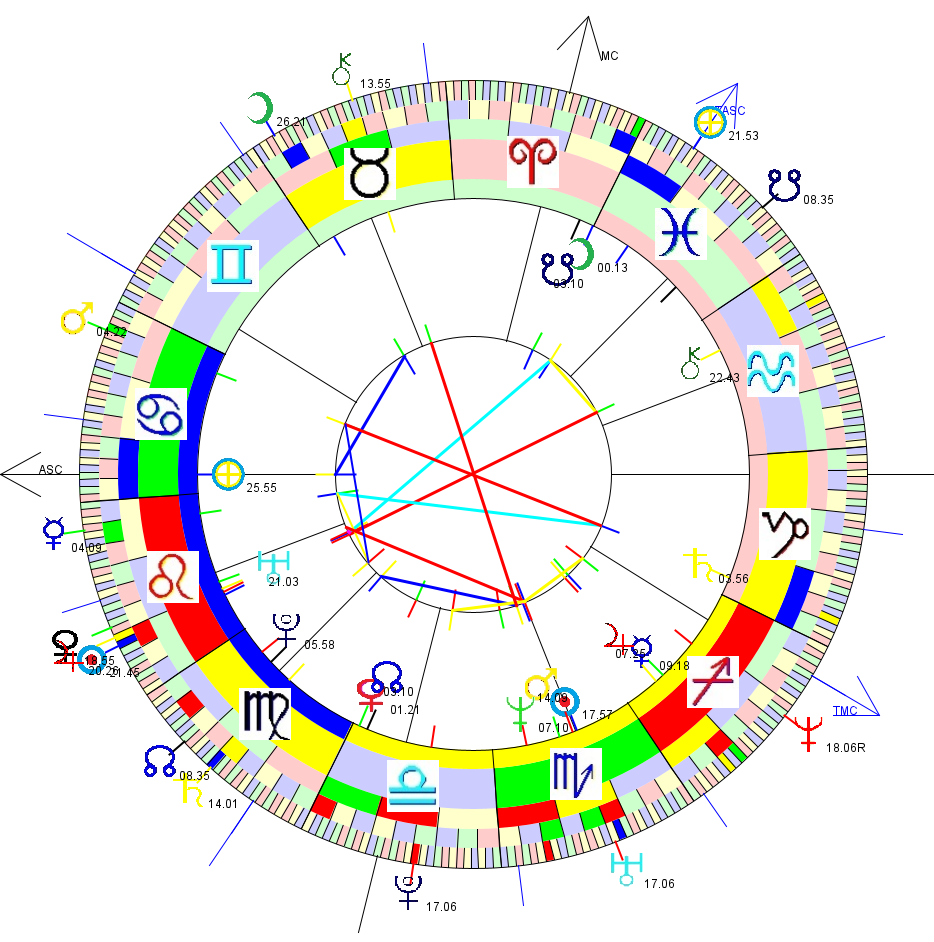 The chart shown is Mackenzie Phillips's birthchart, together with transits for her rape around the outside. Aspect lines [traditional] are between the transits and his birthchart.