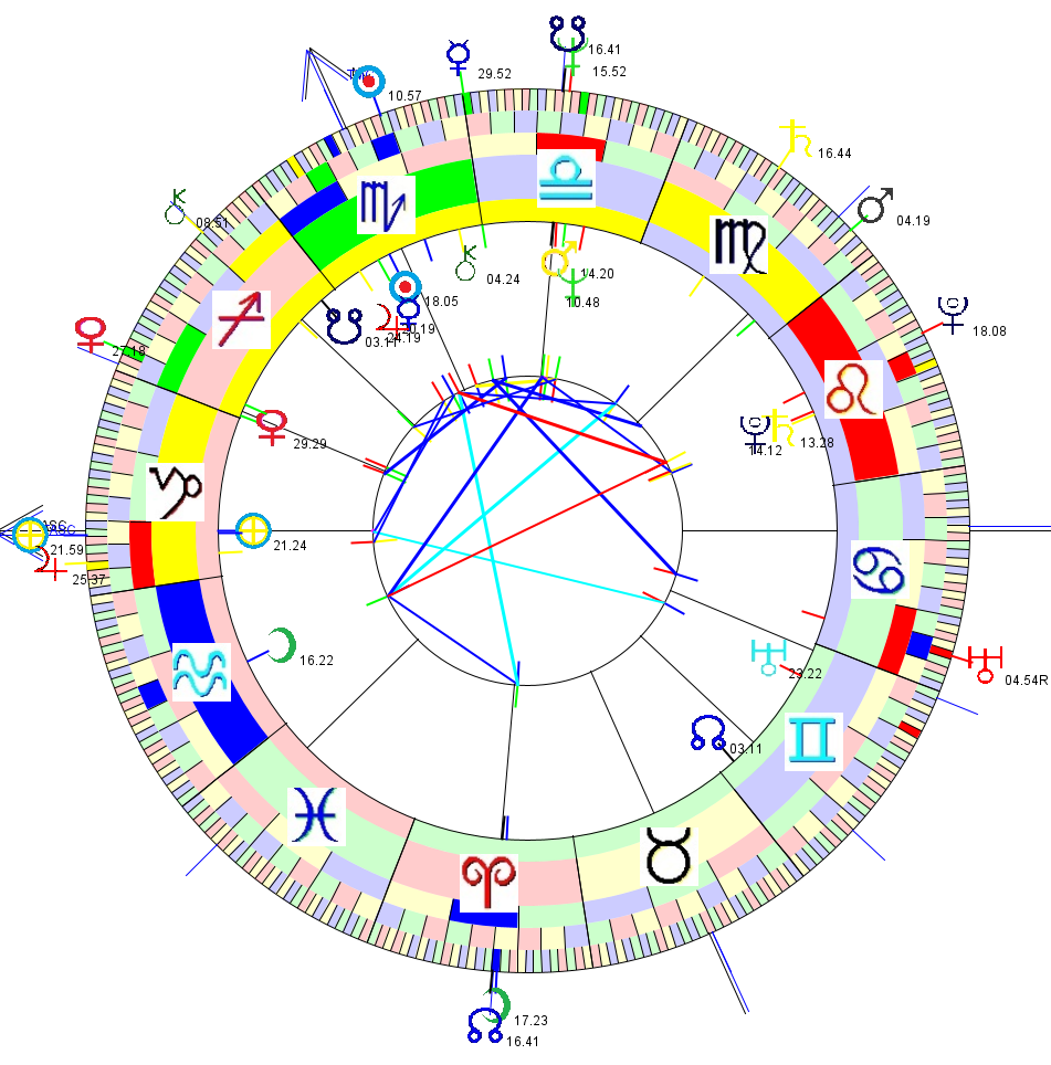 The chart shown is Roseann Quinn's birthchart, together with John Wayne Wilson's birthchart as transits around the outside. Aspect lines [traditional] are between the two birthcharts.