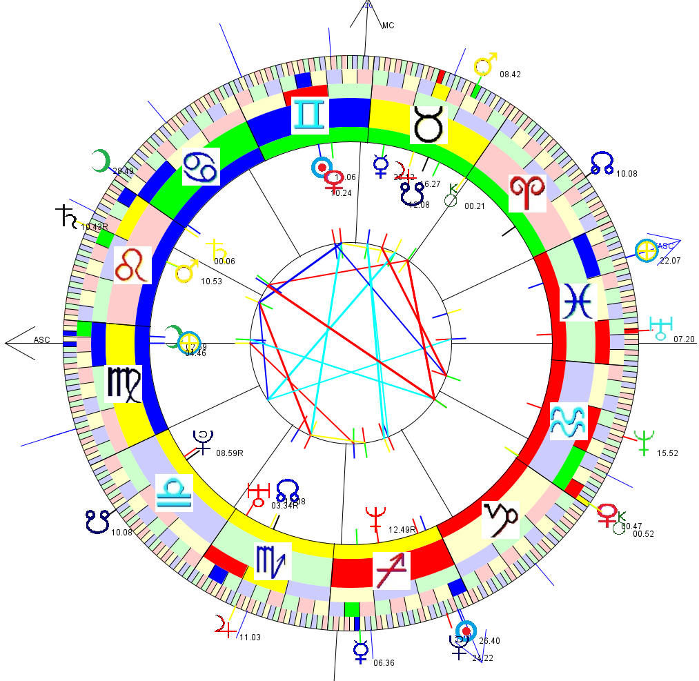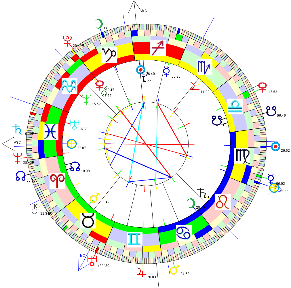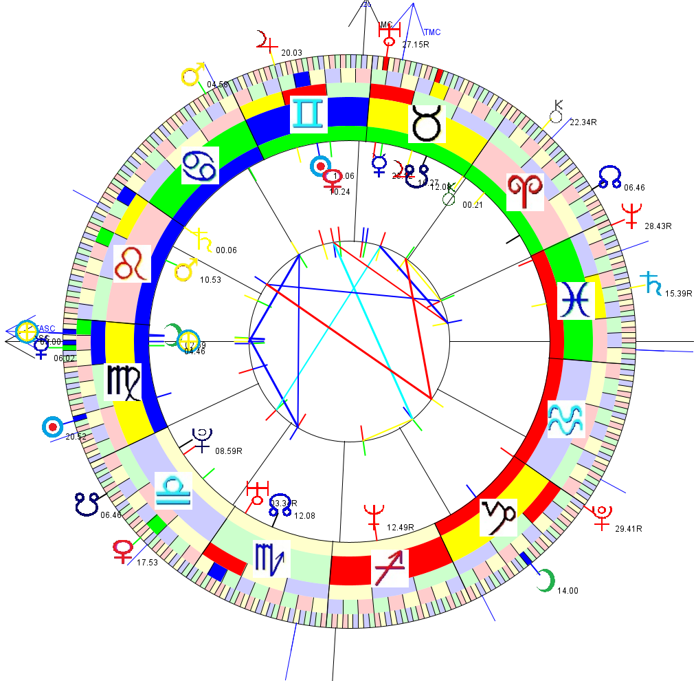The chart shown is Juliana Falcon's birthchart, together with transits for her death around the outside. Aspect lines [traditional] are between the transits and his birthchart.