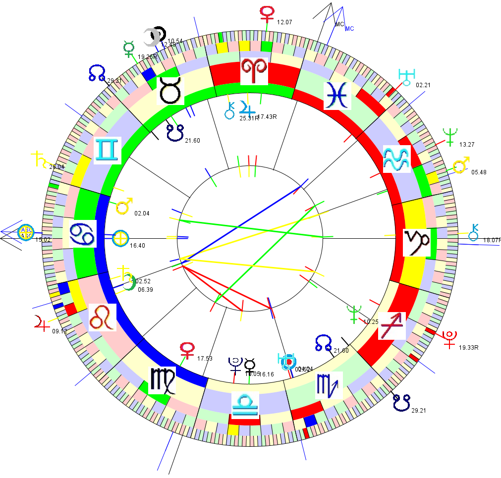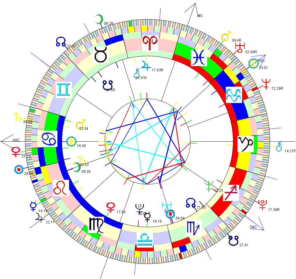 The chart shown is Aron's birthchart, together with the planetary positions at the time of the Publication of his autobiography around the outside. Aspect lines [traditional] are between the transits and birthchart.