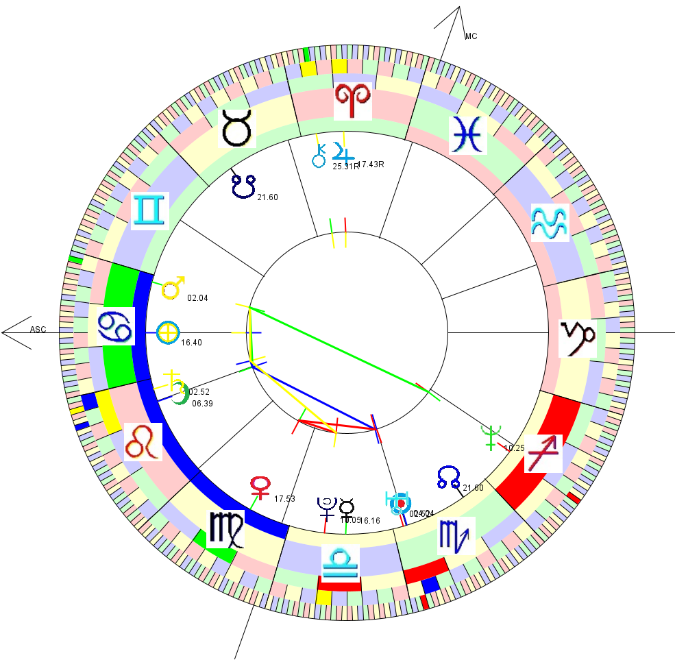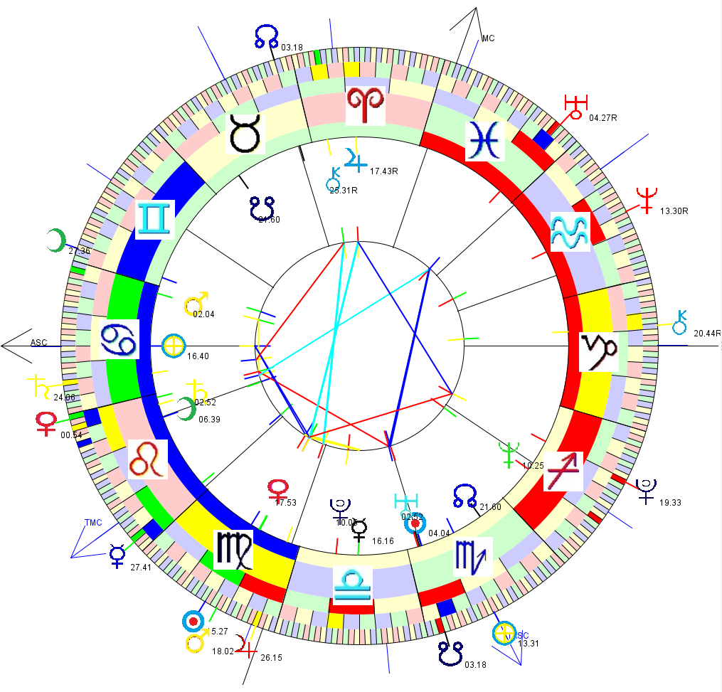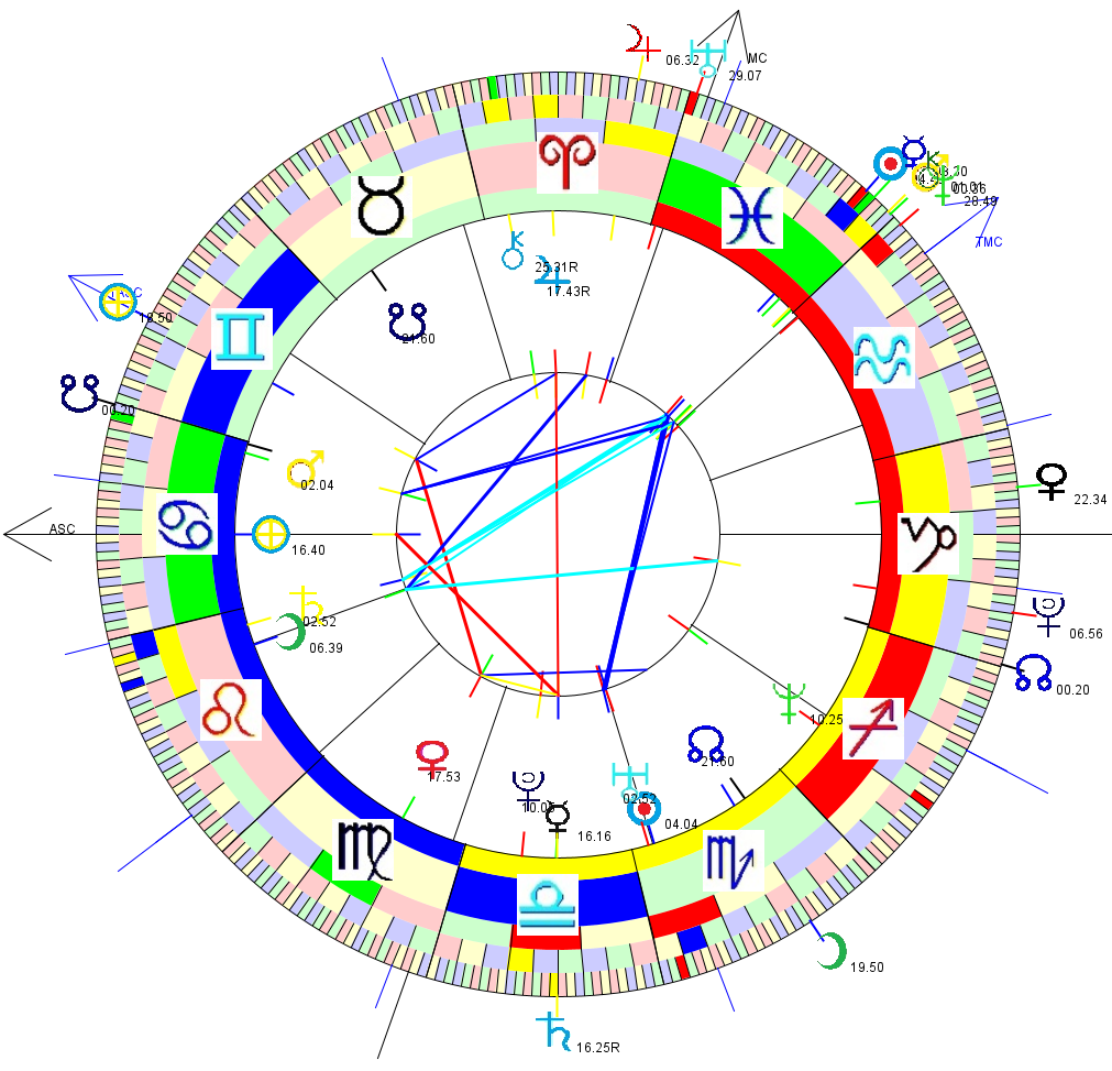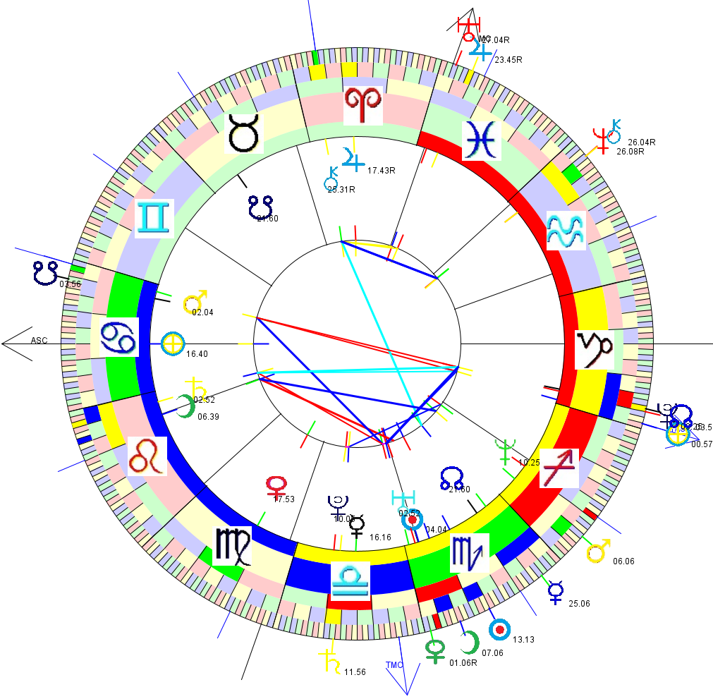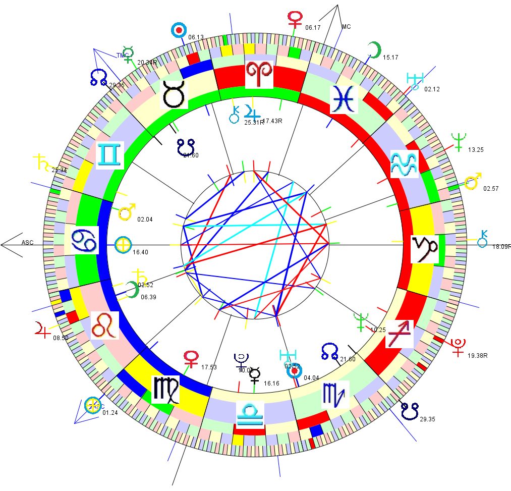 This is a chart for 10pm on Aron's birthday, set in Ohio [which I gather is his birth time and place]. Aspect lines are between natal planets.